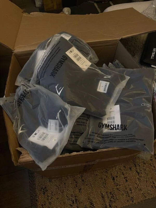 Each containing 300 brand-new mixed Gymshark items with tags.